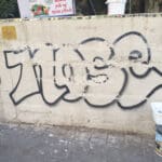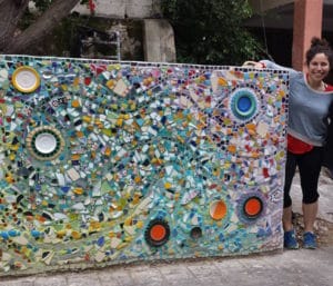 The trash of each building is put in large bins that are placed outside the structure close to the sidewalk but behind a concrete partition that attract all sorts of graffiti. Disturbed by this eyesore, Mia decided to cover the graffiti with a mosaic. Her "raw material" was broken shards of glass, various colored tiles plus some earthenware saucers. One morning she set down her material and began creating her mosaic. Needless to say, designing the pattern and placing each piece in its place, gluing it on the surface and then applying the needed grout to solidify the work, is extremely labor intensive.